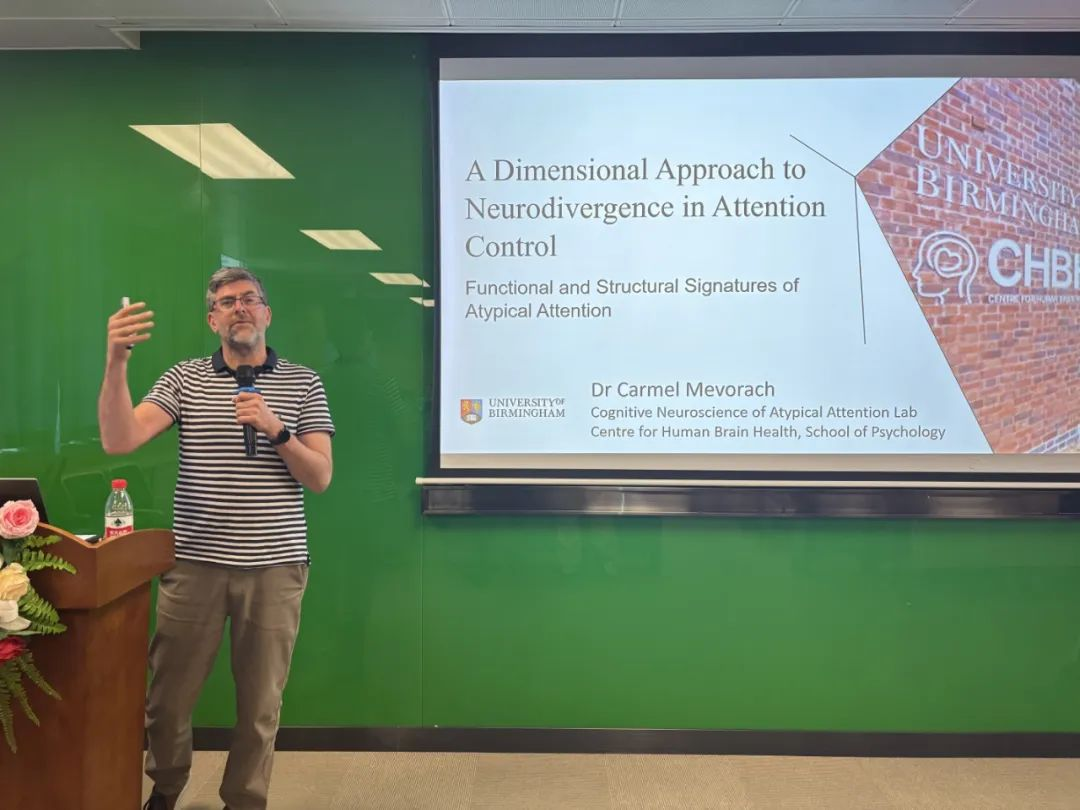 On May 26, 2025, Dr. Carmel Mevorach, Associate Professor at the School of Psychology, University of Birmingham, delivered a compelling academic lecture titled "Investigating Dimensions of Neural Differentiation in Attentional Control: Identifying Functional and Structural Features of Atypical Attention."Dr. Mevorach focused on the mechanisms of attentional control and their variations among neurodiverse populations, including individuals with ADHD (Attention-Deficit/Hyperactivity Disorder), autism, and psychosis. By integrating behavioral experiments with neuroimaging techniques, he explored how attentional traits relate to individual behavior, brain function, and structure. The lecture was divided into two main parts: the first addressing response inhibition in ADHD, and the second examining attentional control in autism and psychosis.