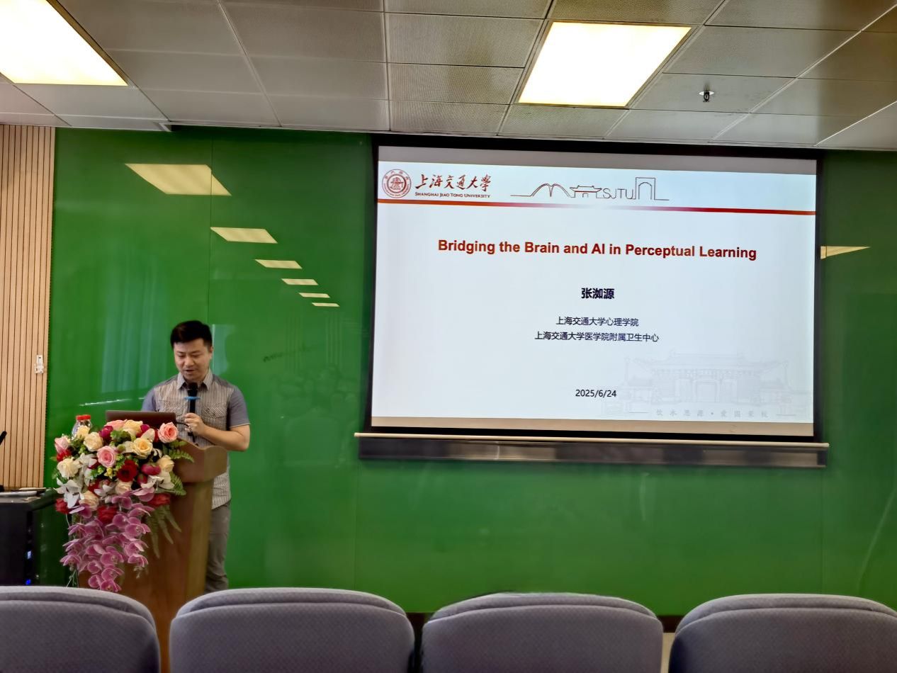 On the afternoon of June 24, Dr. Ru-Yuan Zhang, Associate Researcher at the School of Psychology, Shanghai Jiao Tong University, delivered an academic lecture titled "Bridging the Brain and AI in Perceptual Learning". In his talk, Dr. Zhang shared his team’s recent innovative research at the intersection of brain cognition and artificial intelligence.