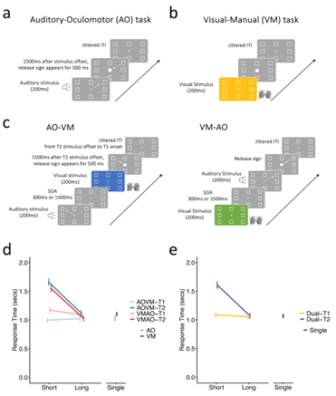 The study employed the classic psychological refractory period (PRP) paradigm, in which participants performed two tasks: making an eye movement in response to different auditory stimuli and pressing a key with their fingers in response to different visual colors (Fig. 1a–c). Behaviorally, the researchers observed the classic PRP effect—under dual-task overlap (interference) conditions, responses to the second task were significantly delayed. This delay reflects the sequential processing mode of the brain when confronted with overlapping task demands (Fig. 1d, e).