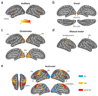 By analyzing brain activation data from the single-task conditions, the researchers identified brain regions and networks associated with different stages of information processing. These included modality-specific sensory regions (auditory and visual areas), motor regions (eye-movement and finger-movement areas), as well as a multimodal central processing region. Notably, this central processing region overlapped substantially with the well-established multiple-demand network, which is known to support performance across a broad range of cognitively demanding tasks (Fig. 2).