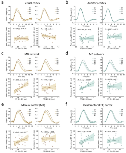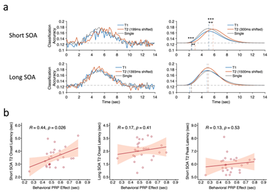 In contrast, within the multiple-demand network, neural activity associated with the first stimulus in the dual-task condition was largely unaffected by the presence of a second task. However, the neural activity associated with the second stimulus was significantly delayed (Fig. 3a). Importantly, this delay in neural activity predicted the behavioral psychological refractory period effect—namely, the reaction time delay (Fig. 3b). These results indicate that, at the central processing stage, information processing shifts to a serial queuing mode.