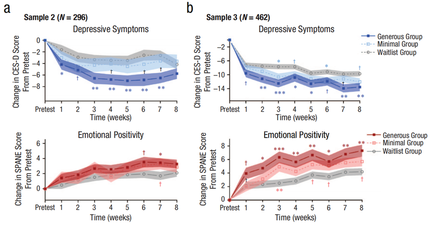 In addition, in Samples 2 and 3, the intervention group was further divided into a minimum-donation group (average daily donation equal to one cent) and a generous-donation group (average daily donation greater than one cent). Results indicated a trend that participants in the generous-donation group benefited more from the intervention (Fig. 4).