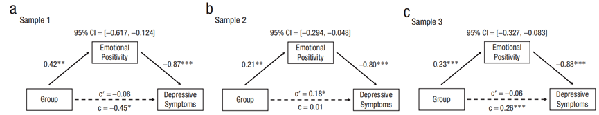 Across all three samples (Fig. 2), the intervention consistently enhanced positive affect among individuals with depression (Cohen’s ds ranging from 0.20 to 0.49) and alleviated their depressive symptoms (Cohen’s ds ranging from –0.19 to –0.46). Moreover, mediation analyses revealed that positive affect served as a mediator of the intervention’s effects on reducing depressive symptoms (Fig. 3).