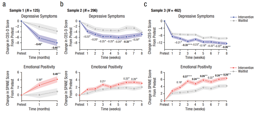 Figure 2. In Sample 1 (a), Sample 2 (b), and Sample 3 (c), participants in the intervention group showed greater improvements in depressive symptoms and positive affect than those in the waitlist control group.