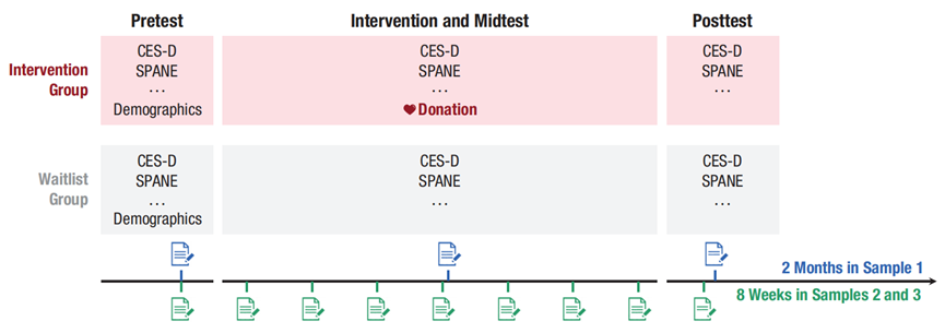 Participants in the waitlist control group did not receive any intervention during this period; they were provided with the intervention materials only after the intervention group had completed the two-month program. To further explore whether the amount donated influenced intervention effectiveness, in the latter two samples the researchers also collected participants’ daily donation amounts.