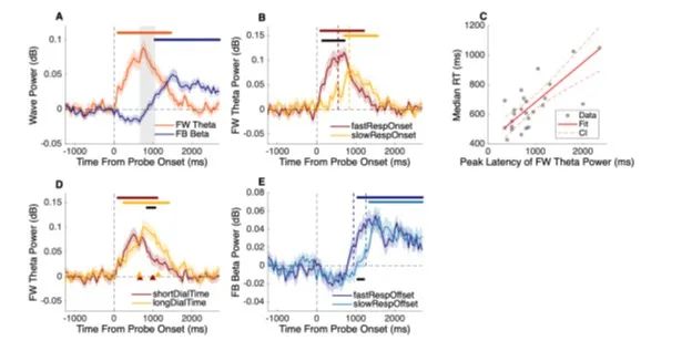 The results showed that during the response phase, significant feedforward theta (2–6 Hz) traveling waves and feedback beta (14–32 Hz) traveling waves emerged across electrodes spanning task-relevant sensory and motor regions. The feedforward theta waves appeared just before response initiation, reaching peak strength at the onset of the response. Notably, their activity could reliably predict both the initiation time and the duration of participants’ responses (Fig. 2A–D). Following response completion, beta traveling waves propagating in the opposite direction were observed. The timing of these feedback beta waves was predictive of participants’ response termination (Fig. 2A, E).