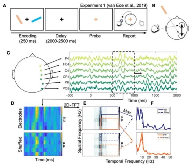 To address this question, the researchers analyzed two publicly available datasets (Experiment 1 and Experiment 2). In the analysis of Experiment 1, they first examined whether traveling waves occurred between task-relevant brain regions during memory-guided responses. In this experiment, participants were required to memorize and later recall the orientation of a line presented either in the left or right visual field, and then respond with either their left or right hand (Fig. 1A). The pairing of stimulus location and response hand was fully randomized—for example, a left-field stimulus could be responded to with either the left or the right hand. This design allowed the researchers to dissociate task-relevant brain regions associated with stimulus location and response hand (i.e., contralateral regions), thereby enabling a targeted investigation of traveling-wave activity between these areas (Fig. 1B). Subsequently, the EEG signals recorded during the response phase were subjected to traveling-wave analysis. This method represents EEG data as a two-dimensional matrix, with electrodes on one axis and time on the other. By identifying spatiotemporal patterns within the matrix that exhibit clear directional structure, the analysis detects the presence of potential traveling-wave activity (Fig. 1C–F).