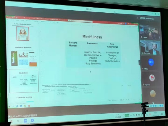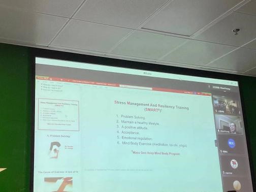 随后,杨世贤主任基于麻省总医院身心计划的项目经验,向同学们介绍在中西文化结合下的压力管理方法——SMART(Stress Management And Resiliency Training)。SMART方法中主要包括问题解决、保持健康的生活方式、积极的态度、学会接纳、情绪调节、身心锻炼(包括正念、冥想、太极、瑜伽、八段锦等)。