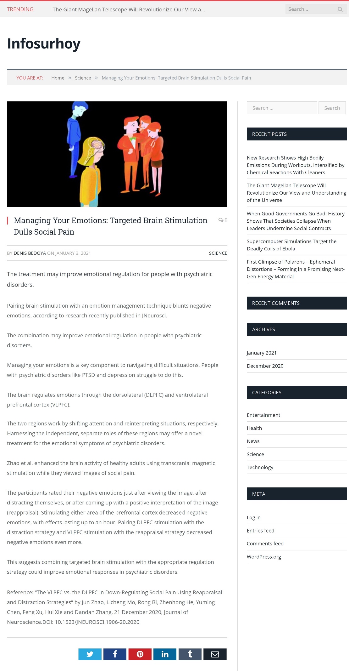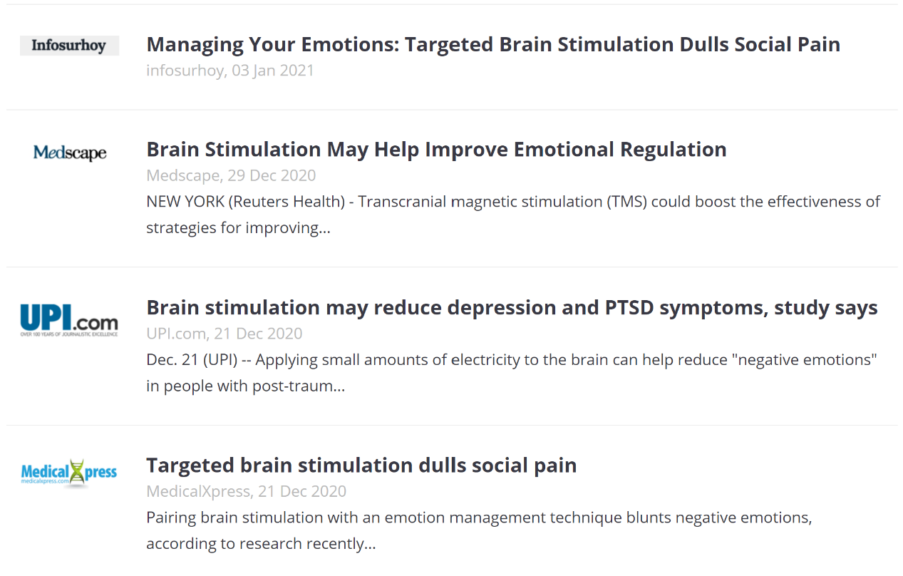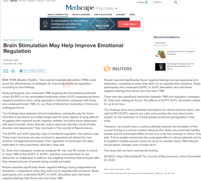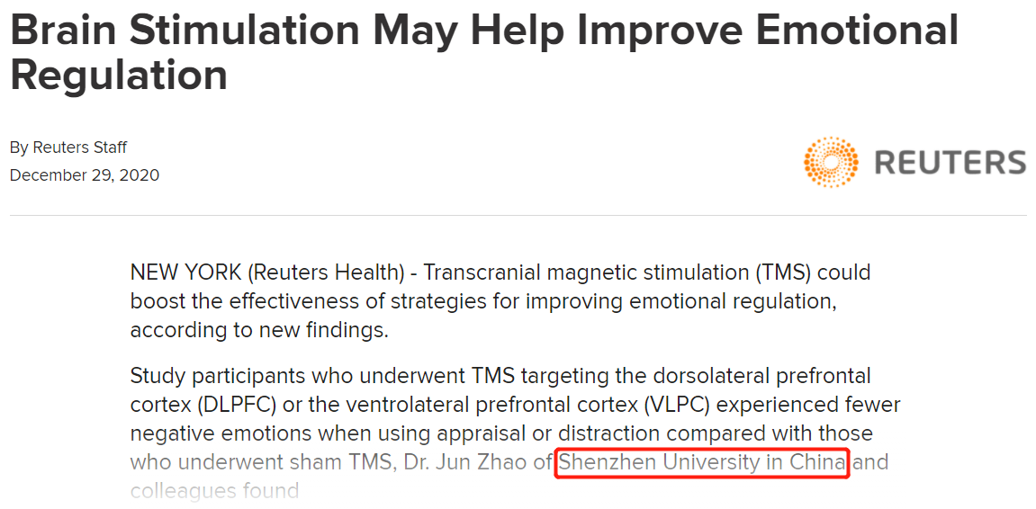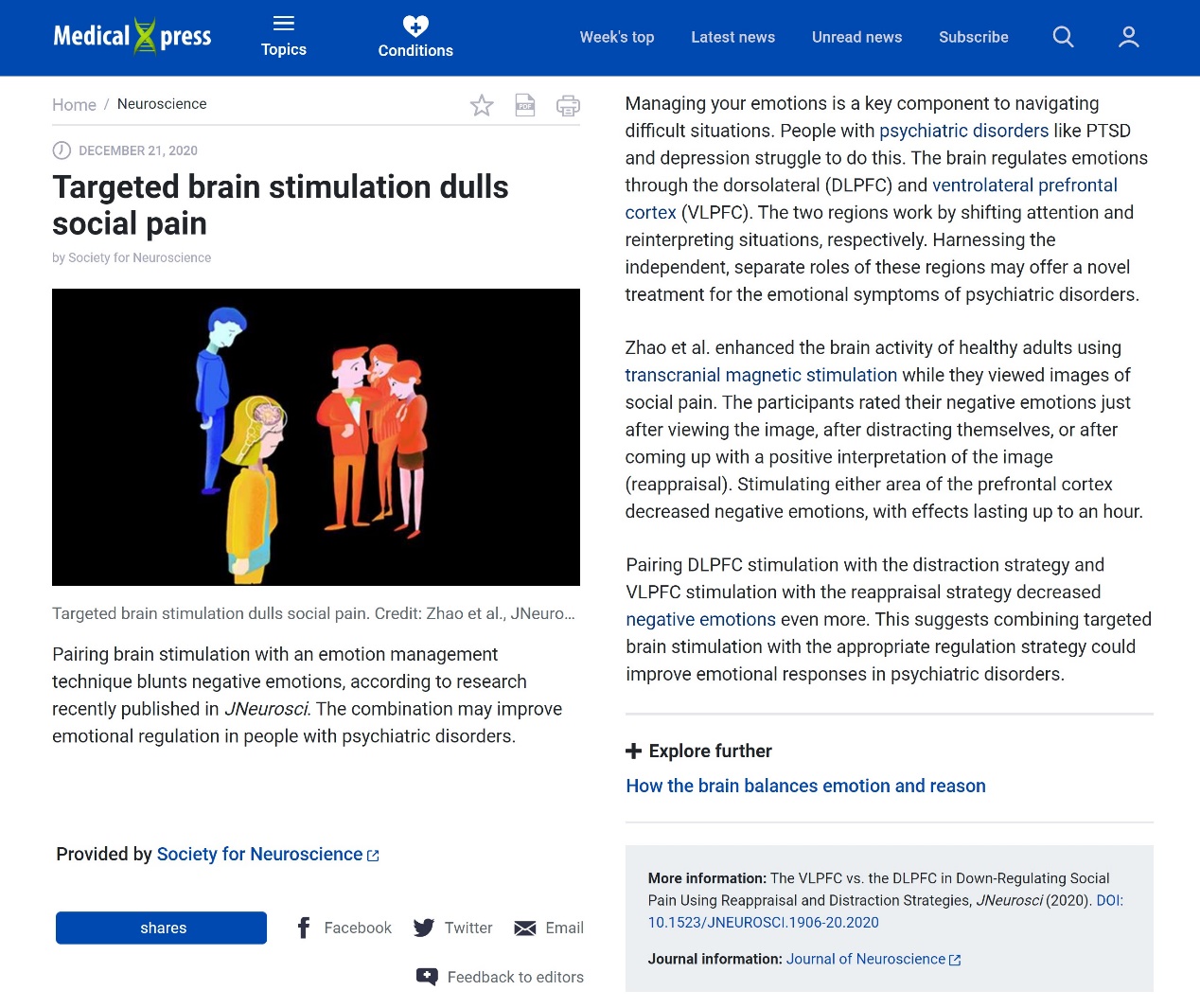 近期,我院张丹丹教授课题组在国际神经科学顶级期刊The Journal of Neuroscience发表了题为“The VLPFC versus the DLPFC in downregulating social pain using reappraisal and distraction strategies”的学术论文。该研究采用新的研究视角和技术手段揭示了情绪调节的认知神经机制,并提出了改善社会疼痛的神经调控干预策略。该研究成果被杂志编委会推荐为“press promotion”文章;发表当月即引起同行高度关注,被评为杂志当期“featured research”,并被路透社、合众国际社等多家重要国际媒体专题报道(见图,部分完整报道图见文末)。