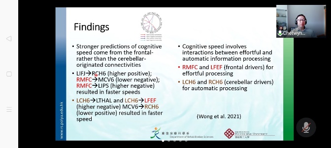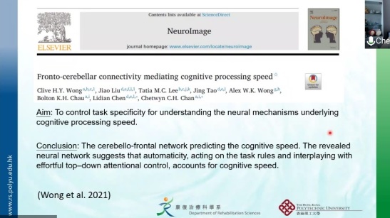 Chetwyn Chan教授从加工速度谈起,首先向大家介绍了有关快速加工的脑机制及皮质-小脑网络的知识,随后分享了其团队关于额叶-小脑连接对于认知加工速度调节的研究成果。该研究指出小脑-额叶网络预测了认知速度,而该神经网络提示,遵循任务规则以及与自上而下的注意控制相互作用的自动化程度则决定了认知速度。该研究进一步发现,认知速度的预测工作更多为额叶所承担。认知速度涉及非自动的(需作出努力)和自动信息处理之间的相互作用,其中右内侧额叶皮质(RMFC)与左侧额叶眼动区(LFEF)负责非自动的信息加工,而RCH6和LCH6负责自动化信息加工。Chetwyn Chan教授还分享了老年人的加工速度预测问题上的研究与发现。