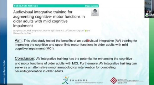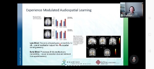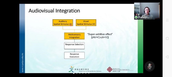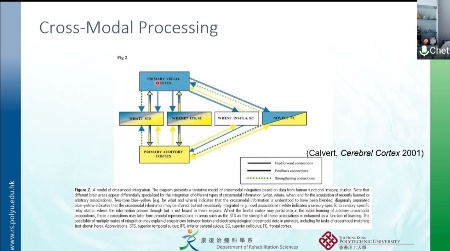 随后,Chetwyn Chan教授由跨模态加工/学习的概念引入,展示了基于现有数据收集建立起的跨模态整合模型,并阐述了模型中不同脑区在整合跨模态信息时体现出不同形式的分工。Chetwyn Chan教授从早期失明患者听觉-空间学习的相关研究展开论述,指出整合加工的学习很可能受到联想神经网络的调节,跨模态加工与学习模型或在研究多感官整合的机制问题中大有用处。Chetwyn Chan教授再从视觉-听觉整合角度切入,结合老化作用对于视听整合的影响以及视听综合训练对轻度认知障碍老年人认知运动功能的影响,指出多感觉整合作为跨模态学习的一种,能够帮助增快加工速度、优化反应表现;而结合现有的神经网络与感觉整合或许能对跨模态学习作出解释。