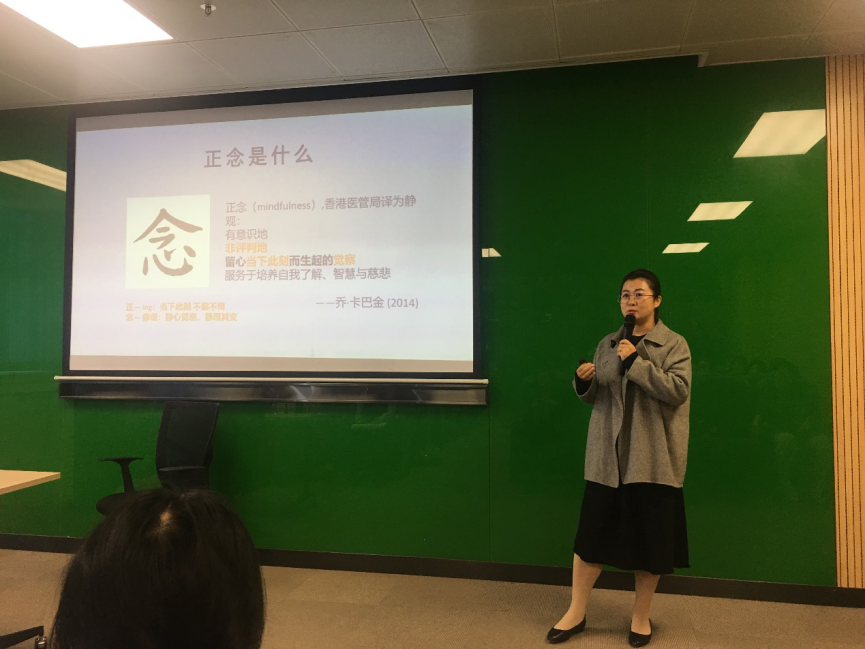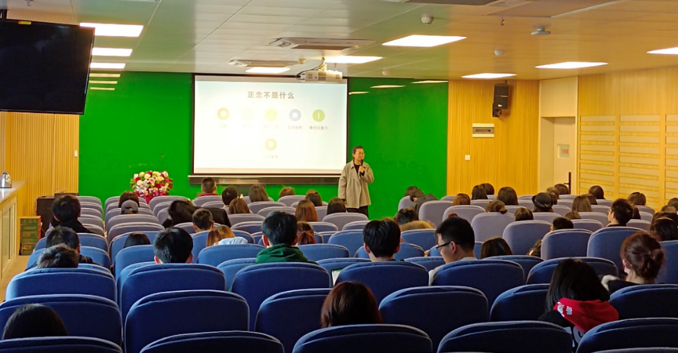 在上午的讲座中,张满老师从正念的定义、历史渊源及其在各领域的应用进行详实的介绍,并通过现场练习引导师生体验正念的内涵和作用。张满老师首先澄清了大众对正念的定义和练习目的可能存在的理解误区,她强调正念不仅仅是“培养专注力”,其目的也并非“消除杂念”,而是带着不评判、接纳的态度觉察当下(包括外界事物和内在身心状态)。张满老师阐明了当今备受关注的正念认知疗法(MBCT)的课程脉络、内容框架及其原理,解释其在预防抑郁症复发上的成效。