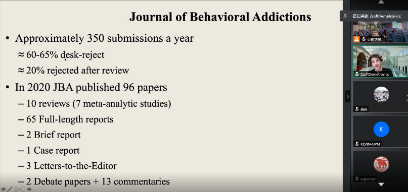 Zsolt Demetrovics主编首先向大家简要介绍了行为成瘾期刊,并分享了审核投稿文章的全过程。《行为成瘾》是一本创刊于2011年的国际知名期刊,编辑委员会成员来自于22个国家。该期刊每年大约会收到350篇投稿论文,每收到一份投稿时,主编们会先进行内部初步审阅,当他们认为这篇论文没有足够的潜力在日后发表,该论文就会被拒稿。Zsolt Demetrovics表示大约1/3的投稿文章会被发送至外部审核,最终只会有20%左右的稿件被接受并发表于期刊上。以2020年为例,《行为成瘾》共发表了96篇论文。