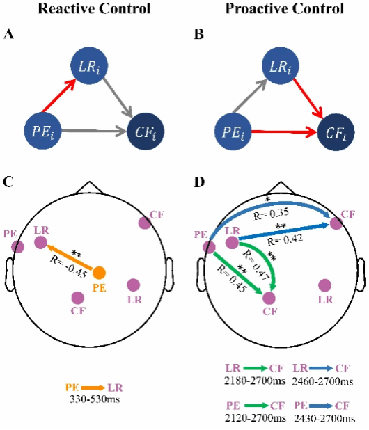 (3) The directed connection strength reflecting the update of learning rate was significantly correlated with reactive control during the stimulus phase; The directed connection strength reflecting the update of the predicted conflict level was significantly correlated with proactive control in the late intertrial stage. This result is consistent with the assumptions of the hierarchical Bayesian model.