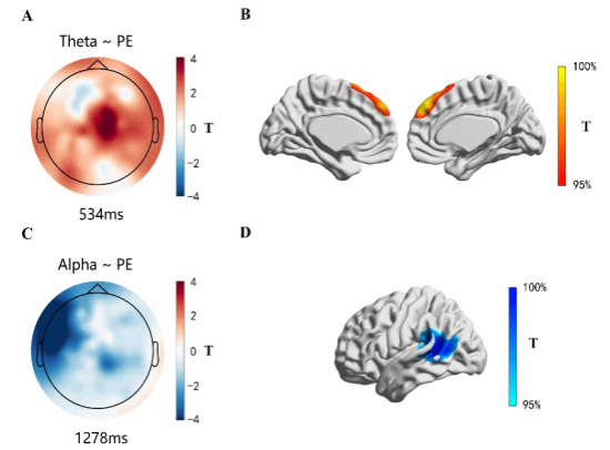 Figure 2: Neural correlation between prediction error (PE) and Theta band (A, B) and alpha band (C, D).