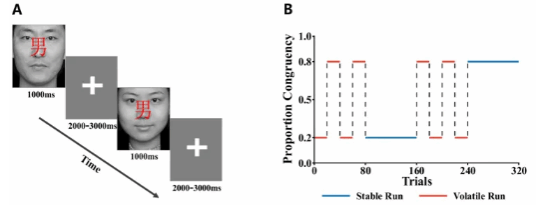 The research team recruited 31 participants who simultaneously recorded behavioral data and EEG activity during the face version STROOP task. The study manipulates the proportion of incongruent trials (80% and 20%) to create a volatile and stable environment, and uses a hierarchical Bayesian model to fit the trial-wise congruency and response time, so as to realize the trial-by-trial inference of the learning rate, prediction conflict and prediction error. We analyze (1) the neural correlation between model variables and oscillations in different frequency bands; (2) directed connectivity patterns between regional neural oscillations associated with model variables; (3) The relationship between directed connection strength reflecting the model variables update with proactive and reactive control.
