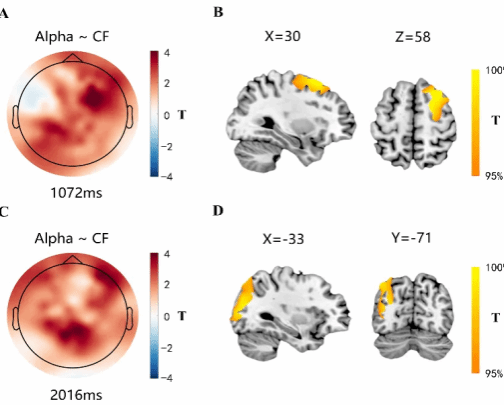 Figure 4: Neural correlation between predicting conflict levels (CF) and alpha bands