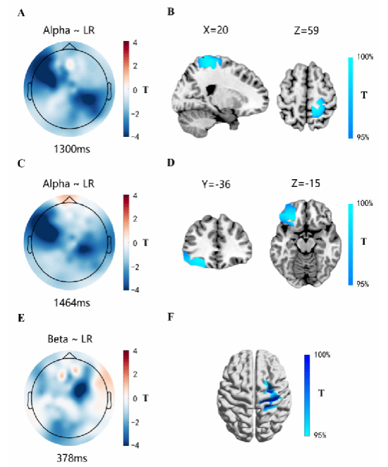 Figure 3: Neural correlation between learning rate (LR) and alpha bands (A, B, C, D) and beta bands (E, F).