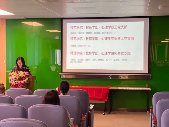 首先是奏《国际歌》,全体党员及积极分子起立。随后,师范学院(教育学部)心理学教工党支部书记焦璨同志致辞。紧接着主持人宣布了参加宣誓的新党员名单:师范学院(教育学部)心理学教工党支部胡舰纯、洪志纯、黄婧婷、周雨锴四位同志于2021年3月31日加入中国共产党,师范学院(教育学部)心理学专业博士党支部于倩倩同志于2021年4月16日加入中国共产党,师范学院(教育学部)心理学研究生党支部毛雅雯、张振达、湛毅林、刘研、萧楚钧、杨丹丹、吴燕珍、王冠华八位同志于2021年4月6日加入中国共产党。