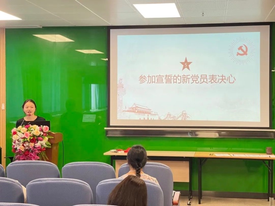 参加宣誓的新党员上台,面向党旗,准备宣誓。由沈蝶同志领誓,宣誓人宣誓。老党员也一同重温了入党誓词。随后参加宣誓的每一位新党员同志依次向党组织表决心,部分宣誓人和宣誓内容如下。