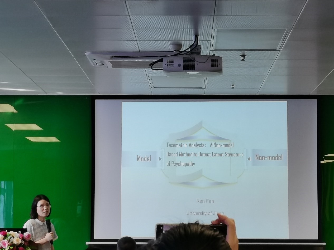 2008级校友任芬(现为济南大学教育与心理学院讲师)作了题为“Taxometric Analysis:A Non-model Based Method to Detect Latent Structure of Psychopathy”的报告,基于抑郁和精神病态的实证数据,采用非模型的方法从本质上区分潜变量结构的“类别”和“维度”。