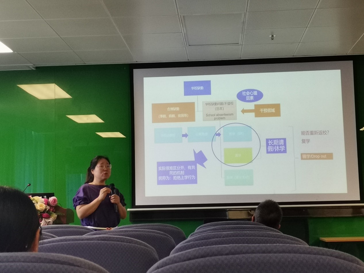 2009级校友何丽(现为北京联合大学师范学院心理系讲师)作了题为“他们为什么不上学?中学生拒学现象的个案研究”的报告,以北京市拒学的七位中学生为案例,从多个方面分析出了拒学的影响因素,提出了拒学影响因素理论模型和拒学干预的模型。