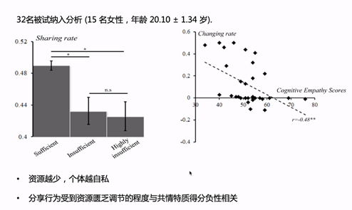 崔老师系统介绍了在资源匮乏的情况下,亲社会分享行为减少的神经机制及其与共情之间的关系。首先,崔老师提出了该研究的理论假设,即资源匮乏通过抑制共情相关的神经活动减少资源分享行为,故分享行为受到资源匮乏影响的程度,应当与个体的共情能力存在负相关。