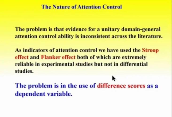Randall W. Engle教授指出,常用的注意控制测量任务如Flanker和Stroop范式将不同条件下反应时的差异分数作为一个因变量,而这并不适用于个体差异研究。其团队的一项研究表明,研究对象间的相关性增强时,差异分数的可靠性相应减弱。与此同时,大多数以反应时为基础的测量任务并不考虑准确性,被试在速度和准确性间的权衡很大程度上会影响测试结果,而注意控制任务中表现出的反应时差异究竟是个体注意控制能力的差异还是个体加工速度的差异也难以得知。综合以上因素,Randall W. Engle教授提出在个体差异研究中应当避免使用以反应时为基础的测量方法,而使用以准确性为基础的测量方法。