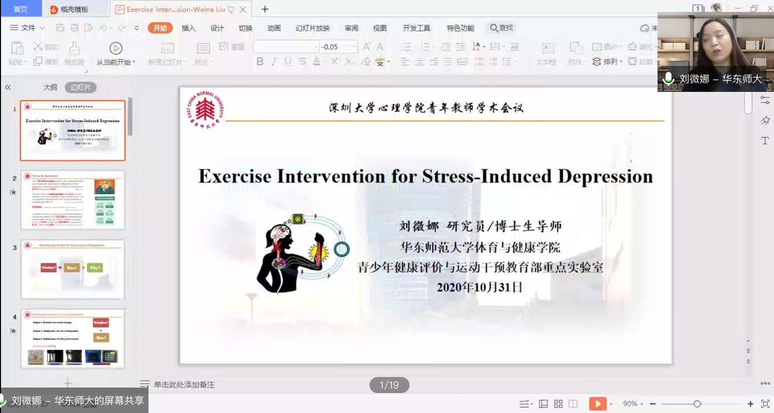 开幕式结束之后,围绕认知、运动与脑科学等方面,有三位青年教师做了学术报告。这三个报告分别是华东师范大学体育与健康学院刘微娜研究员题为“Exercise intervention for stress-induced depression”的报告(线上)、福建中医药大学刘娇副教授题为“中国传统运动、老年认知、疼痛”的报告(线上),以及深圳大学脑疾病与认知科学研究中心尚春峰副教授题为“大脑功能环路解析的新技术”的报告。
