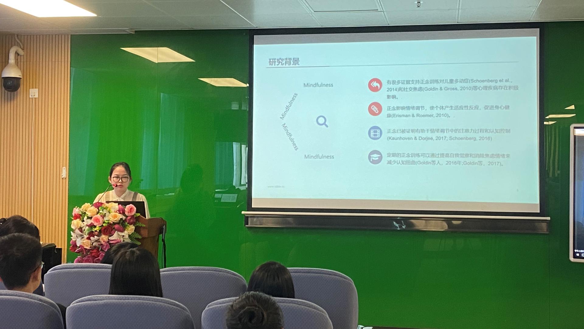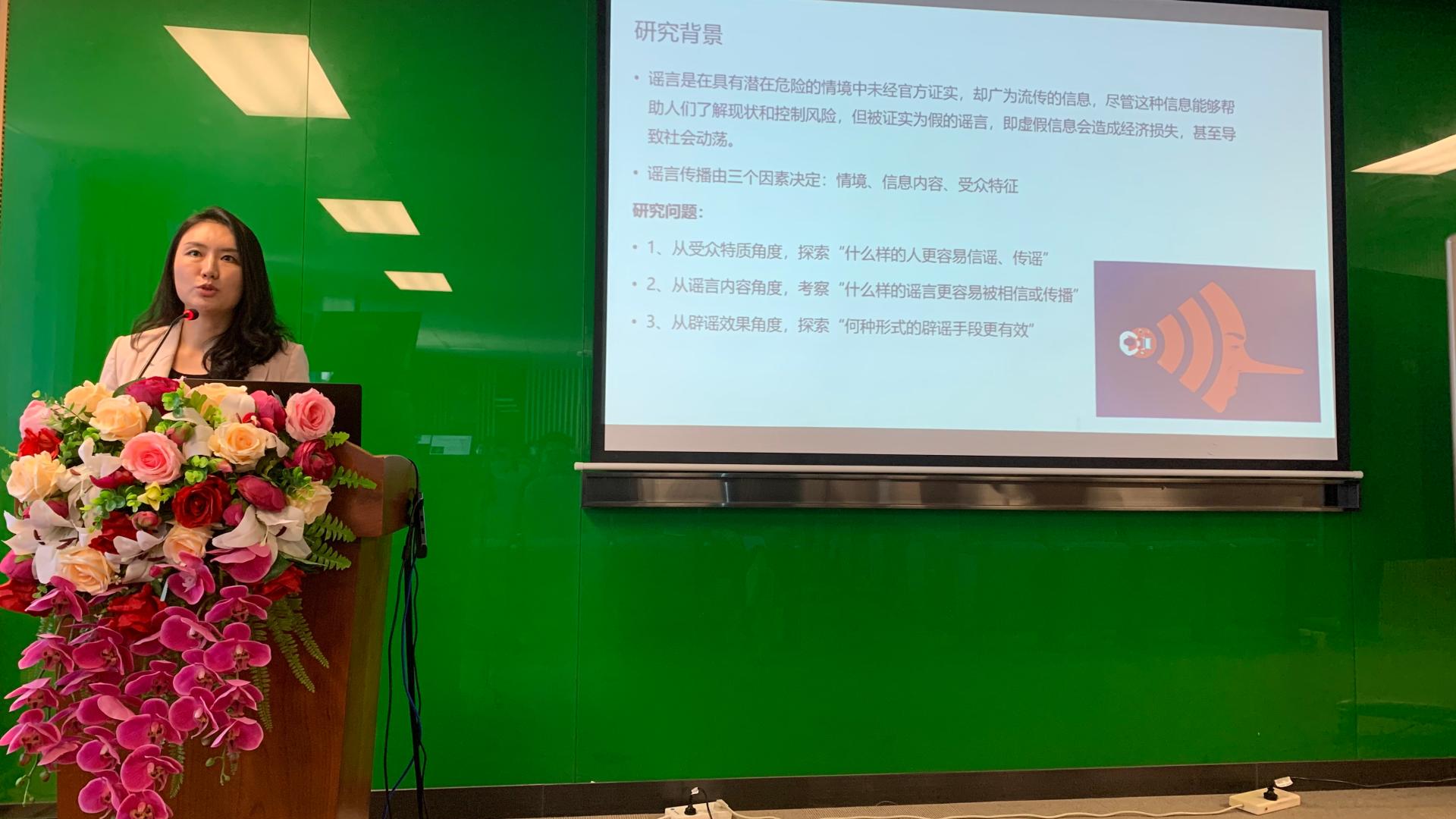 心理学院副院长焦璨教授与基础心理学系主任崔芳副教授主持了会议。会议主题为“社会心理与决策行为”,共有七位青年教师进行学术报告。这七个报告分别为:崔芳副教授题为“社会性框架效应:从决策者视角到评价者视角”的报告、邓欣媚副教授题为“Differences in the Frontal EEG Asymmetry during Emotion Regulation BetweenHigh and Low Mindfulness Adolescents”的报告、吴嵩副教授题为“社会阶层对家长式亲社会谎言的影响”的报告、刘金婷助理教授题为“不诚实行为的个体差异”的报告、吴寅助理教授题为“睾酮与人类决策行为”的报告、迟新丽助理教授题为“The COVID-19 and mental health symptoms among Chinese adolescents: Theimportance of healthy lifestyles”的报告,以及彭晓哲助理教授题为“分析性思维提高对假新闻的辨别能力”的报告。