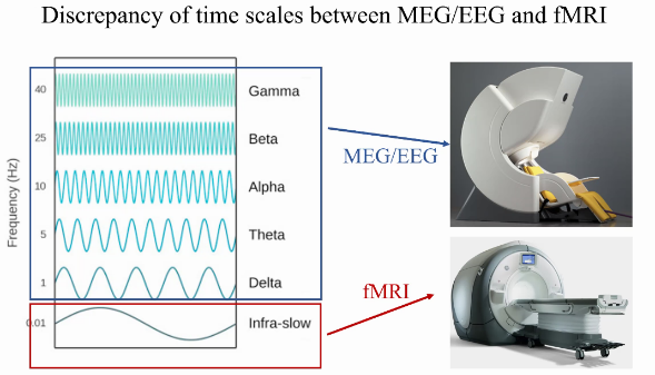 张老师首先介绍了静息态功能磁共振(rs-fMRI)中所使用的一些主要指标以及其神经基础的国内外研究进展。由于功能磁共振只能间接测量神经活动,并且其测量信号的时间维度也与通过脑磁图/脑电图等所测量的神经电生理信号不一致,因此理解rs-fMRI各项指标的神经电生理基础,对于fMRI的临床应用至关重要。