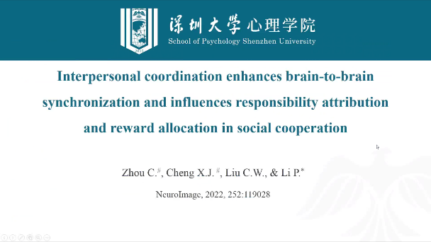 李老师课题组利用双人合作时间估计任务和基于近红外的超扫描技术探讨人际协同过程,发现人际协同组内部合作双方的脑间同步性越高,更倾向于集体责任归因和平均分配;脑间同步性可预测奖励分配,而责任归因起部分中介作用。