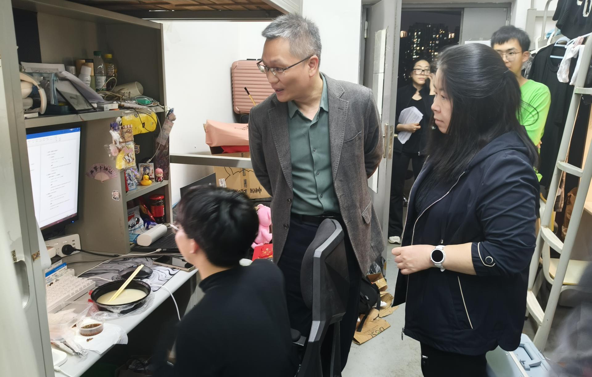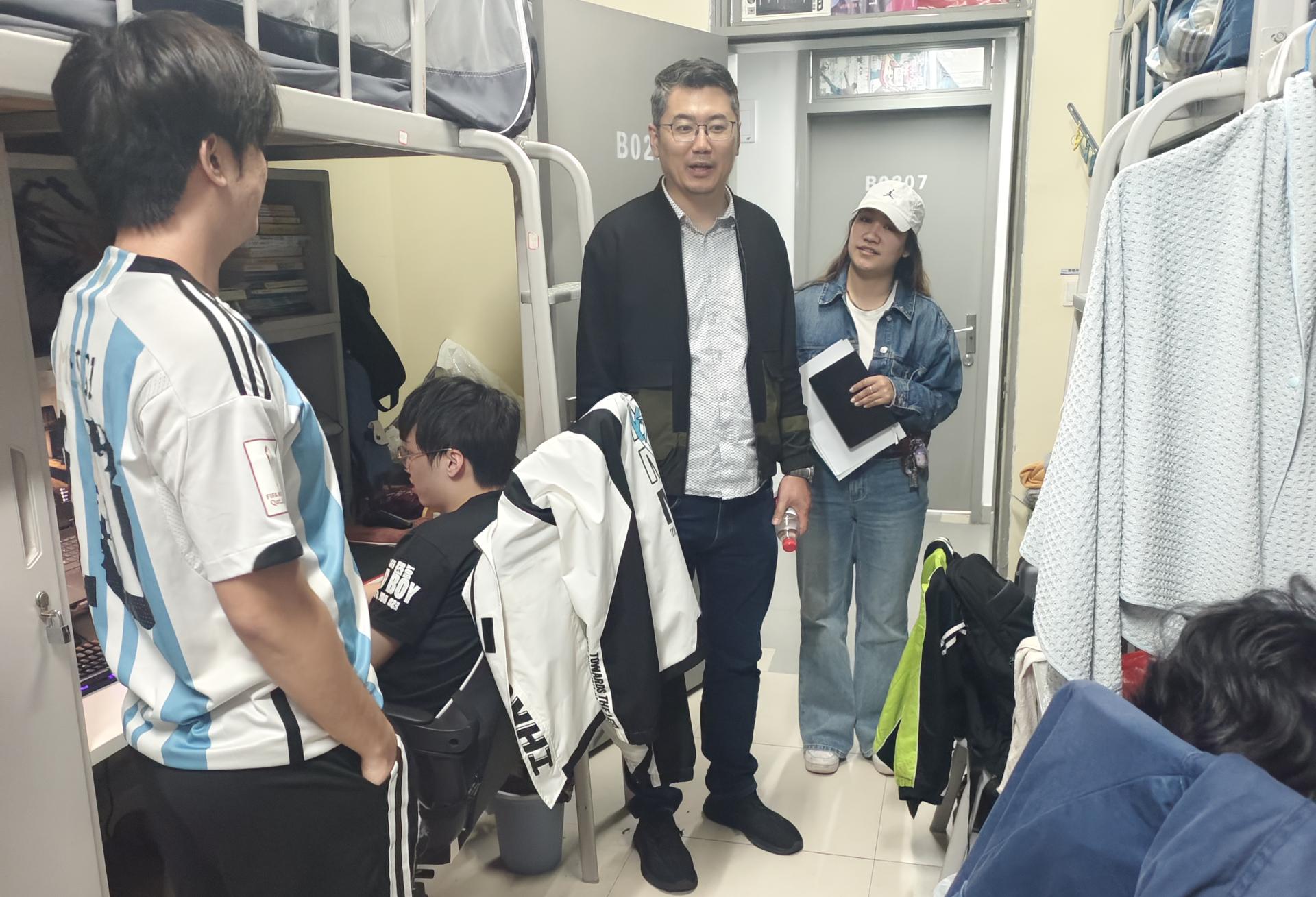 走访组还关注学生寒假返校后的适应情况。老师们特别询问研究生论文进度并给予专业建议,重点关注本科学业预警学生群体。在低年级宿舍,了解补考情况,为压力较大的学生传授 “番茄工作法”,提升复习效率。同时,老师们排查安全隐患,提醒学生注意春季传染病预防及宿舍用电规范。