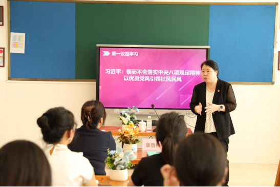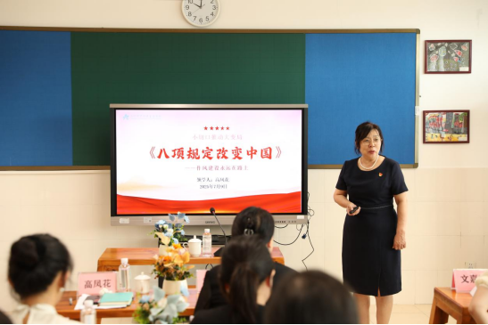 罗湖区星园学校校长、党支部书记高凤花以《八项规定改变中国——作风建设永远在路上》为题,用三组对比展现党风社风深刻变革:一是党风政风焕然一新;二是社风民风向上向善;三是为改革发展注入清流。高书记指出:八项规定是一把“金钥匙”,站在新的历史起点,党员干部要以八项规定为标杆,继续发扬自我革命精神,以优良作风护航中国式现代化新征程!