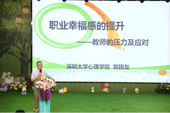 活动最后,由心理学院副院长郭田友为星园学校全体教师带来题为“职业幸福的提升——教师的压力及其应对”讲座。郭田友副院长围绕压力的来源及厘清、压力的自我应对、自我评估与求助三个方面,通过生动的案例,解析了教师常见的心理压力,引导指出压力的自我应对方法及在压力下如何提升幸福体验,让大家对“幸福感”有了新的理解,掌握了调节心理状态的小技巧。