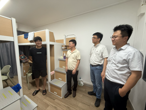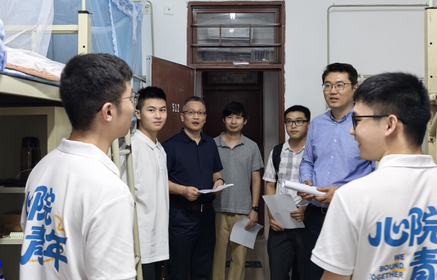 为切实了解 2025 级新生入学后的住宿适应情况,帮助新生快速融入心院集体,进一步加强学院与新生的沟通联系,营造安全、温馨、和谐的宿舍环境,9月2日晚18:30,心理学院院长陈琦、党委章鲁楠书记、郭田友副院长、高亮副书记、李鹏副院长、院长助理赵朔,带领新生辅导员、本科新生班主任及学生助理,开展新生宿舍走访。