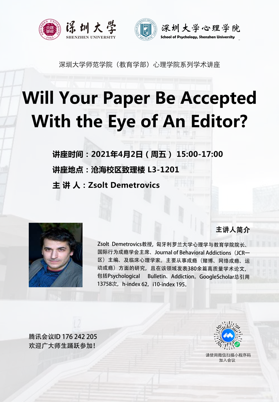 讲座题目:Will Your Paper Be Accepted With the Eye of An Editor?