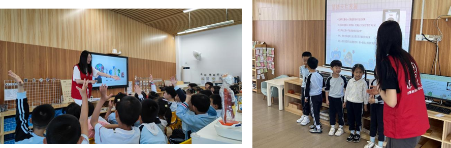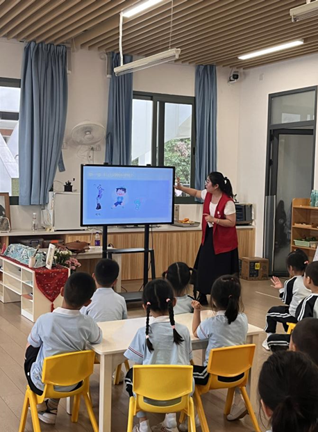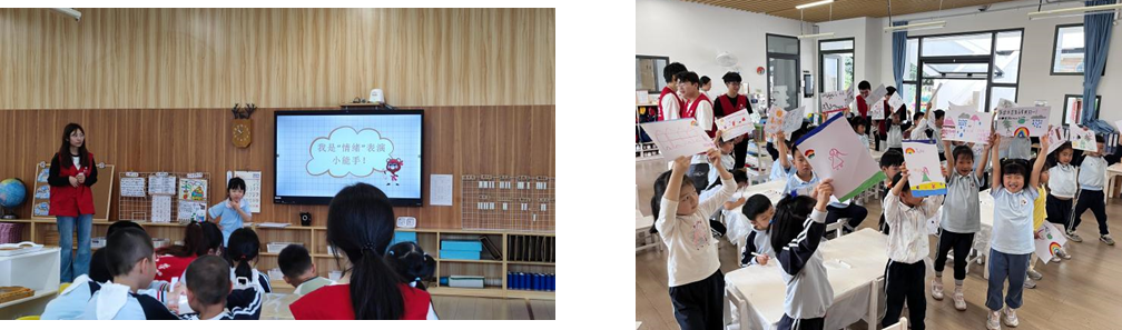 首先,心理学院的4名研究生分别在四个大班开展心理小课堂,通过情绪识别模块,引导他们学会感知、区分不同的情绪状态;通过情绪表达训练,促进幼儿有效沟通内心感受,掌握初步的情绪管理技巧。