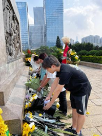 同学们手持鲜花,在工作人员的统一指导下,踏着庄严肃穆的节奏,排成整齐的队伍,由5位代表向革命烈士们默默地献上鲜花,表达对先烈无私牺牲的致敬。