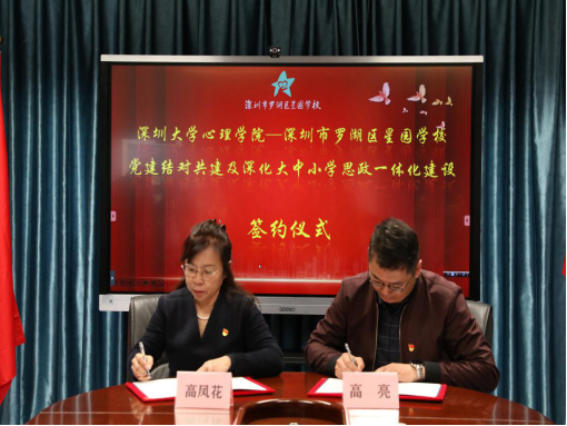 为全面贯彻落实习近平总书记关于教育的重要论述、关于学校思政课建设的重要指示精神,进一步推动党建工作创新发展,落实立德树人根本任务,深化校地合作,1月2日 ,深圳大学心理学院党委赴罗湖区星园学校开展党建结对共建活动。学院党委书记章鲁楠、副院长郭田友、副书记高亮、星园学校书记、校长高凤花、学院相关党务工作者、部分研究生党支部书记、星园学校心理学科教师及党员教师代表出席本次活动。
