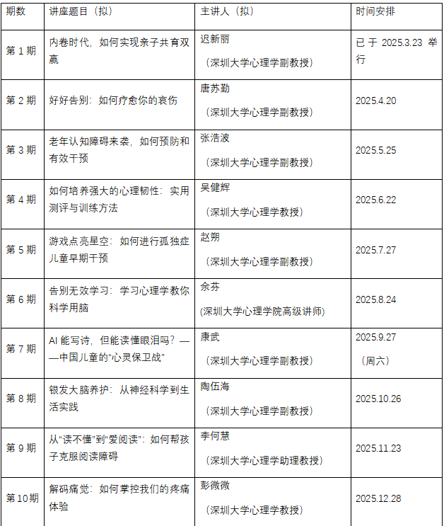 由深圳大学心理学院党员教师、教授学者,将心理学的专业性、实用性和趣味性相结合,帮助广大市民了解心理学的基本理论,提升个人的心理调适能力,构建更为和谐的心理健康状态。该系列活动时间拟定为2025年3月-12月,每月第4个周日下午15:00至16:30举行(如遇假期调休,择期调整),2025年共举办10场。
